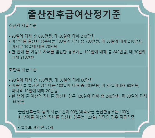 - 지원 기간: 출산 전·후 합산 90일(다태아의 경우 120일)